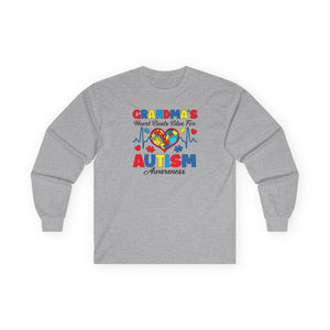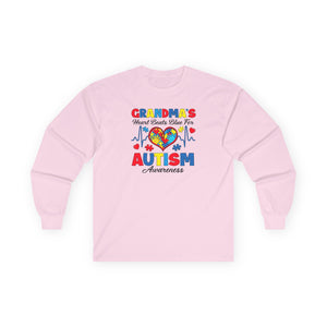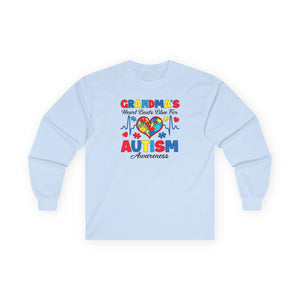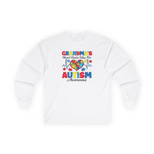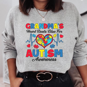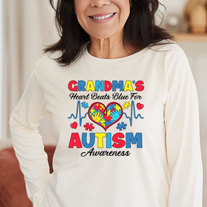 Sharing the love and showing your spectrum support as a Grandmother, with our Grandma's Heart Beats Blue for Autism Awareness, long sleeve shirt.