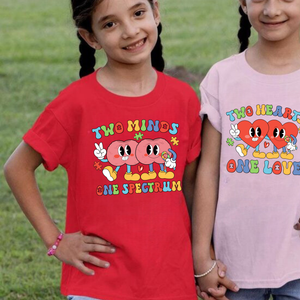 Twinning with your BFF! Your wear the Two Minds One Spectrum tee and your bestie matches in our Two Hearts One Love t-shirt.