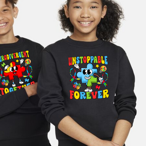 Supporting our Besties on The Spectrum! Match your BFF with our Unstoppable Forever Youth Crewneck Sweatshirt while your twin wears our Neurodivergent Together Youth Crewneck Sweatshirt,